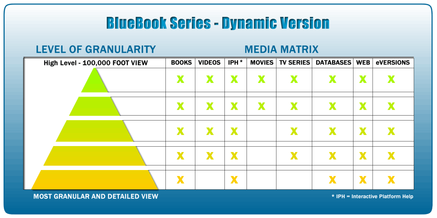The BlueBook Series contains more than just written material. In addition to the written material it also contains nearly every mode of communicating the content from a high level, 100,000 foot overview to the most granular or detailed up close view. Most people will find high level overviews sufficient to get their heads around the overall system. And the Traveler, Citizen, User can rely on in platform help and guide services for assistance when needed. The Media matrix above describes the depth to which various media formats cover content.